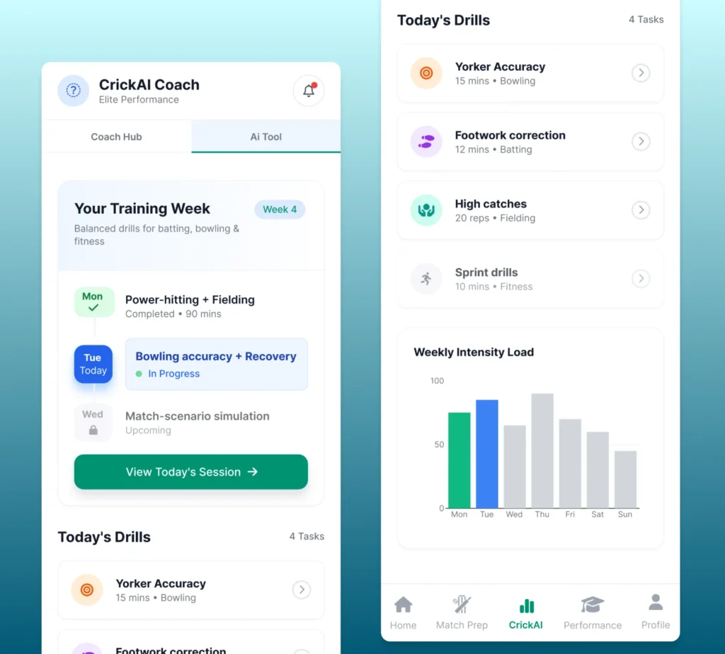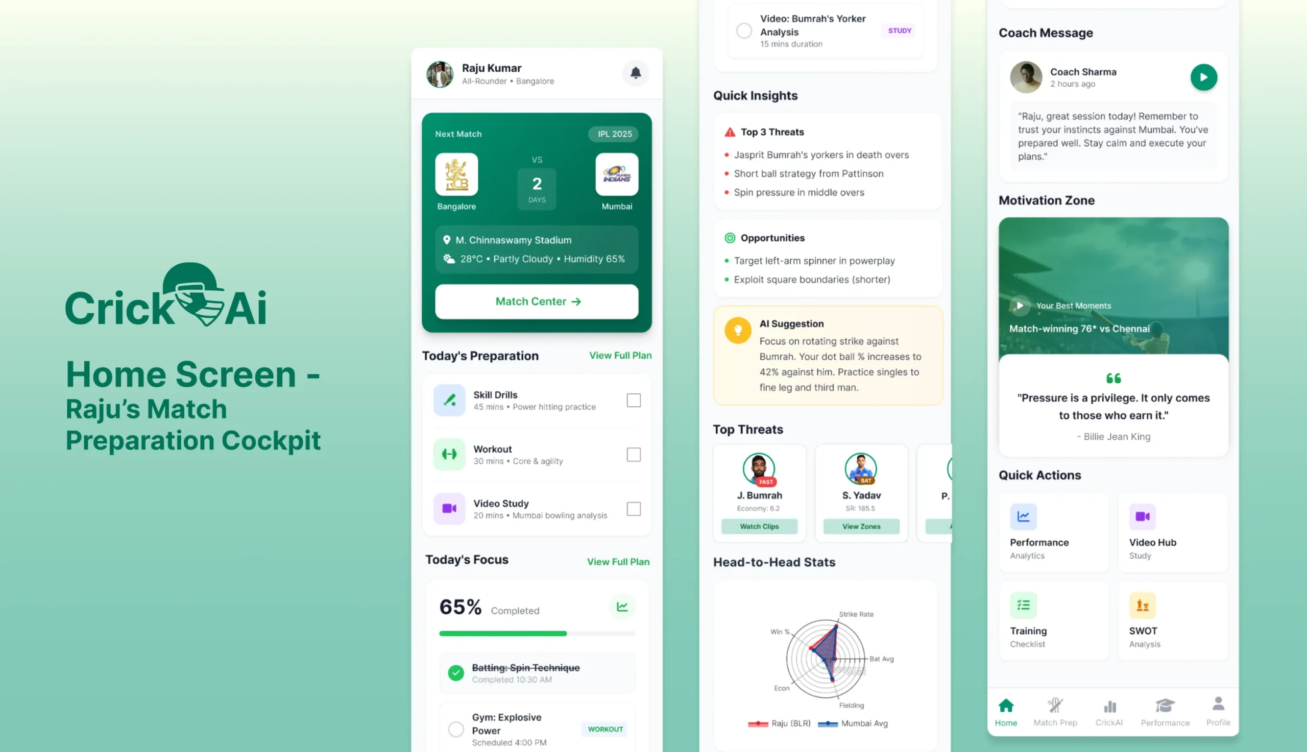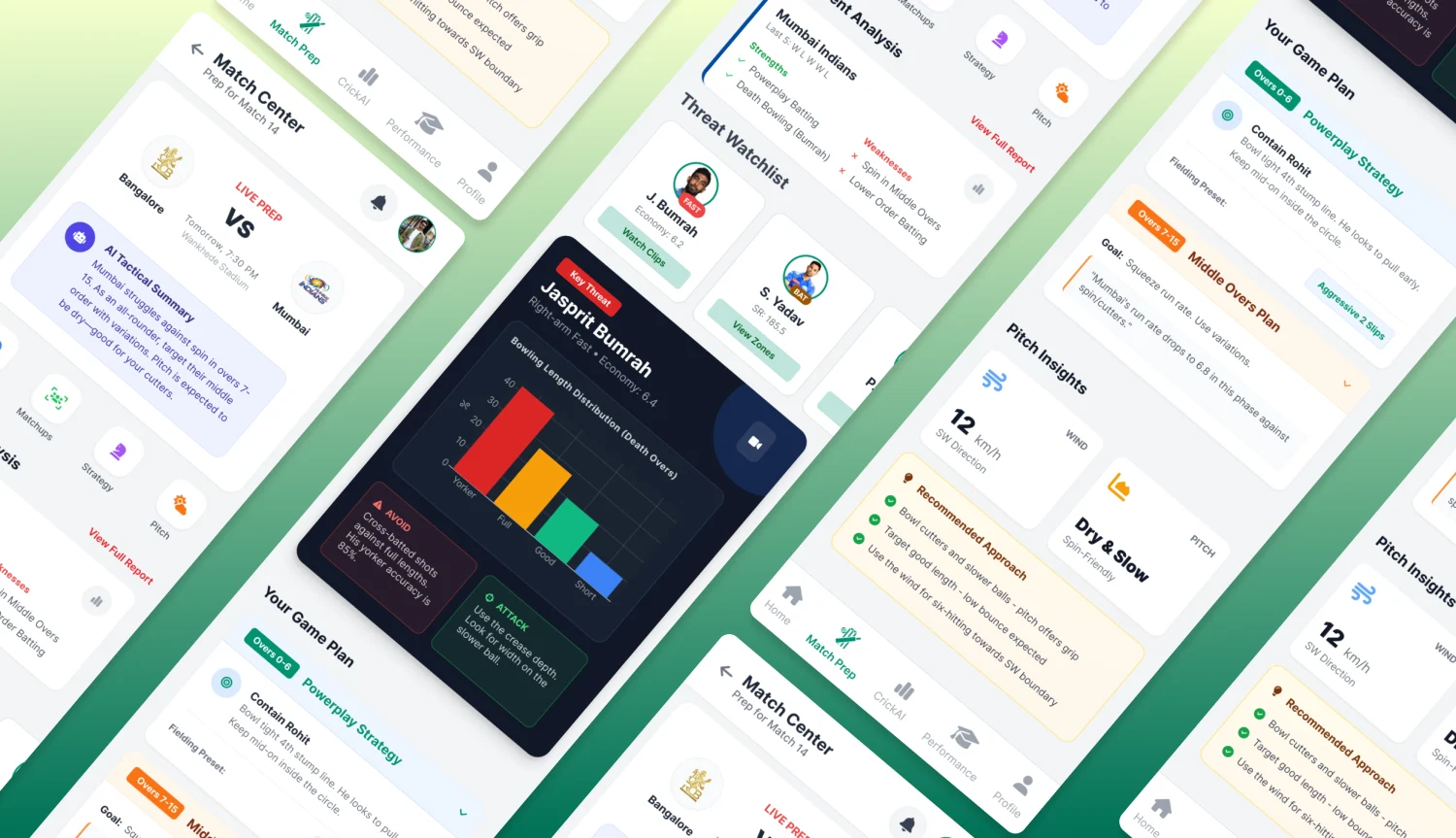 CrickAI is a high-performance mobile app designed for professional and emerging cricketers to prepare smarter for upcoming matches. The app combines AI insights, tactical analysis, training plans, and coach communication into one unified platform.