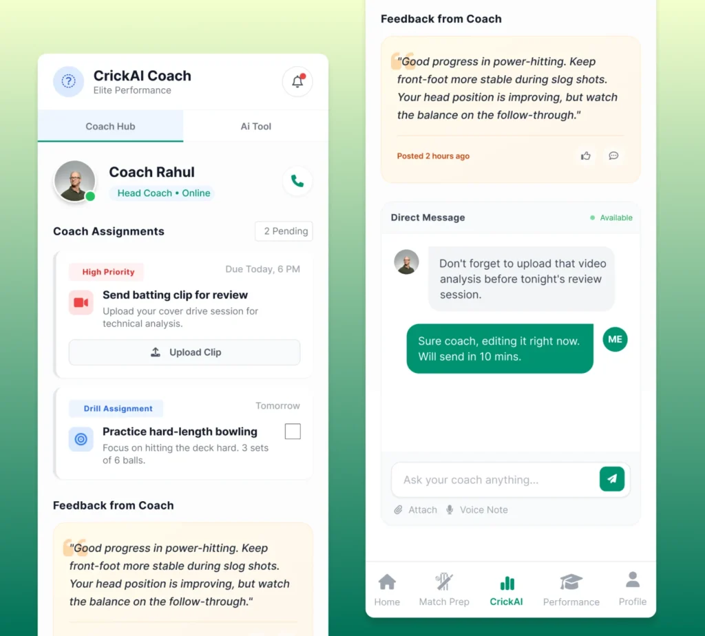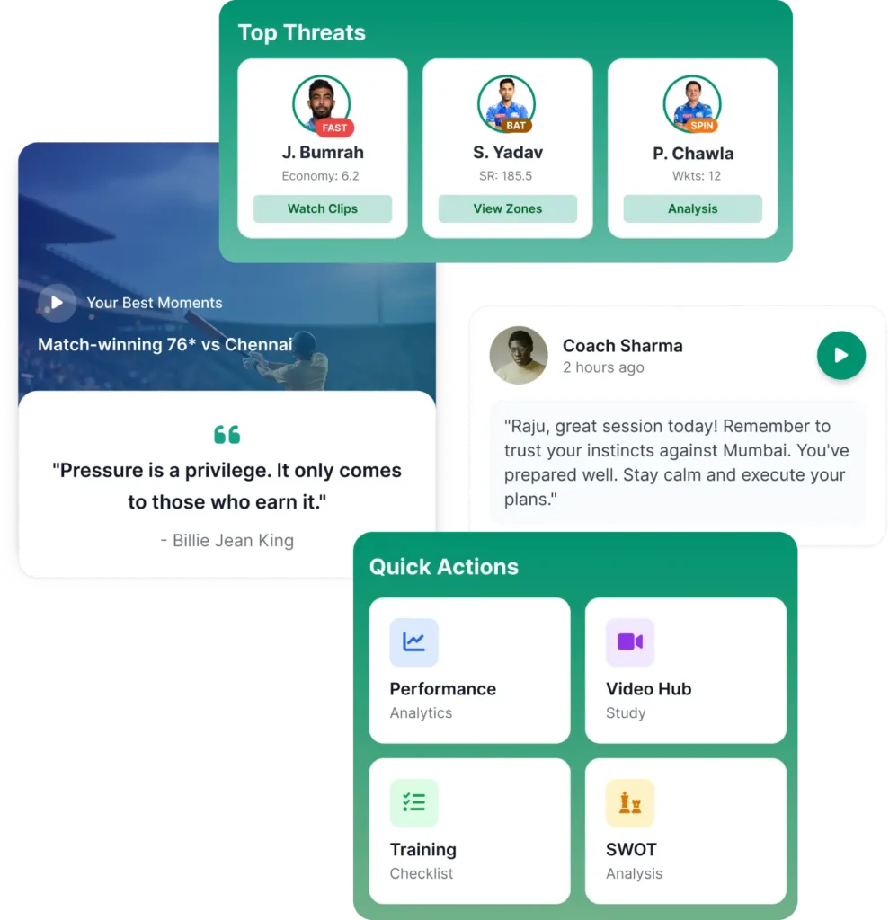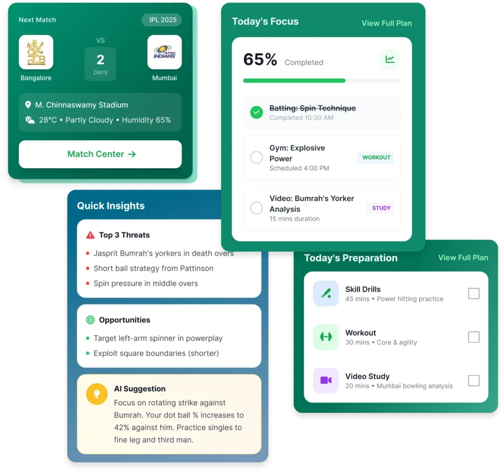 CrickAI consolidates match analytics, training tasks, tactical insights, pitch information, AI suggestions, and coach guidance into one match-ready ecosystem.
