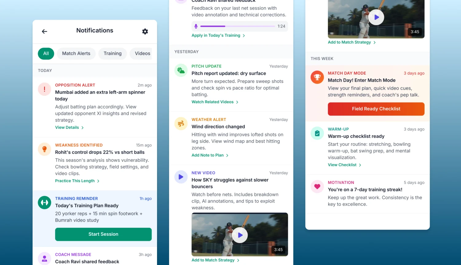 Professional players deal with scattered information across apps, coaching messages, WhatsApp groups, analytics tools, and video platforms.